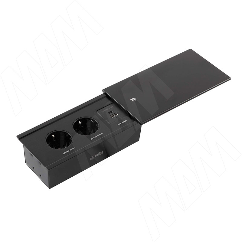 SLIDE блок розеток со сдвижной крышкой, 190*100 мм, 2 розетки, 1 USB, 1 USB Type-C, быстрая зарядка, черный